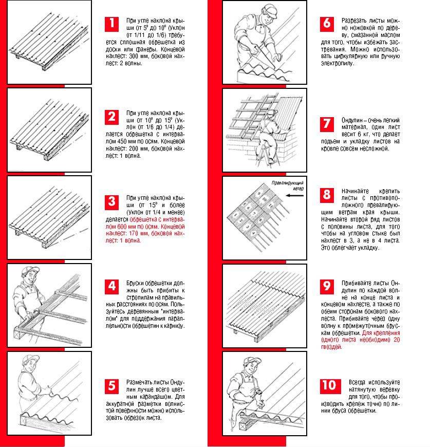 Материал для финишного покрытия кровли выбираем на свое усмотрение. К примеру, хорошо подойдет . Его укладываем с нахлестом, начиная с нижней части ската. Перед укладкой ондулина следует выложить сплошную обрешетку из досок и прикрепить поверх них гидроизоляционную пленку. Вместо ондулина можете использовать шифер или другой материал на ваш выбор.