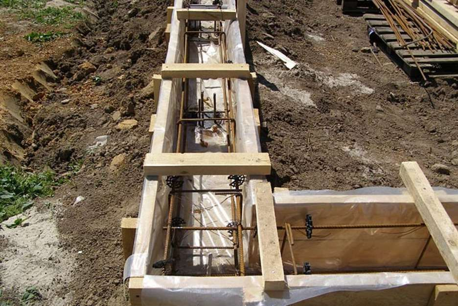 Укладывается опалубка. Проще всего её делать несъемной – после заливки она останется в траншее.