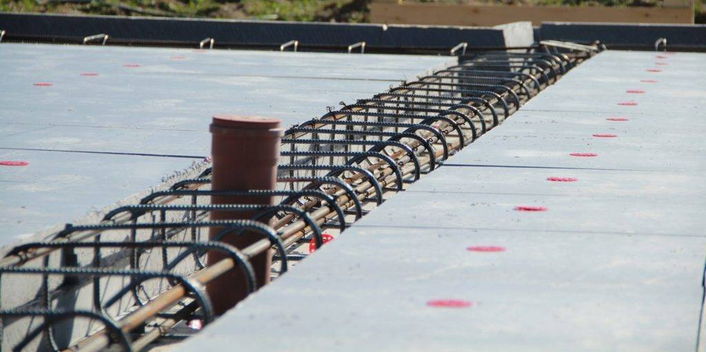 - основной элемент — бетонная плита, в разрезе П-образной формы. Плита укладывается на утеплитель и армируется металлическими прутьями диаметром не менее 12-14 мм;