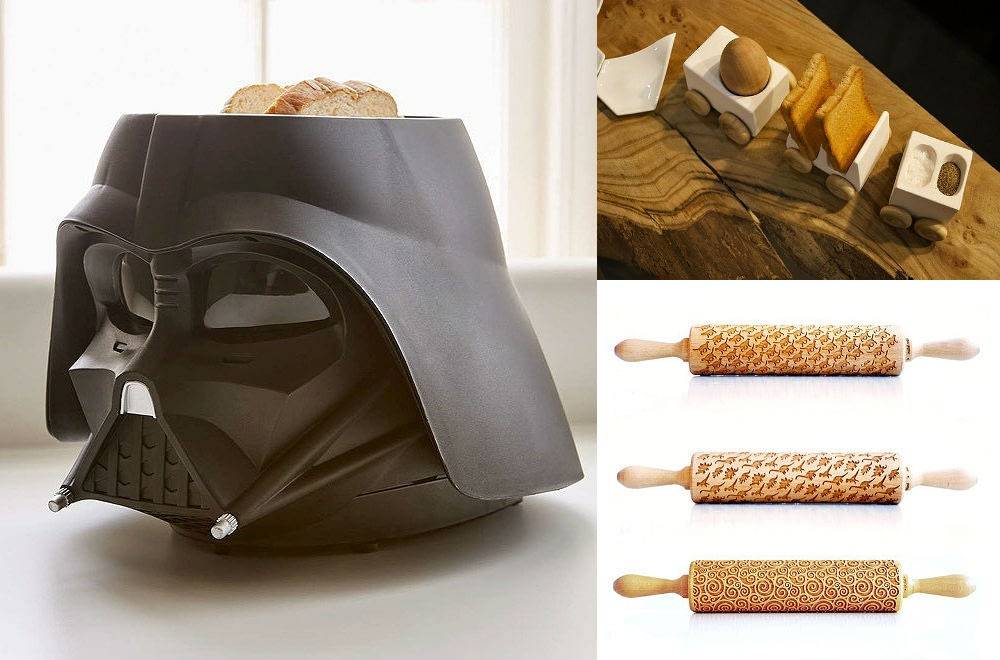 Набор для детского (и не только!) завтрака на скрытых магнитах. Трудно отказаться даже от нелюбимых яиц всмятку, если их привёз такой очаровательный поезд. Кстати, тосты можно поджарить с помощью самого Дарта Вейдера из «Звёздных войн». А печенье украсить, используя скалку с узорчатым покрытием.