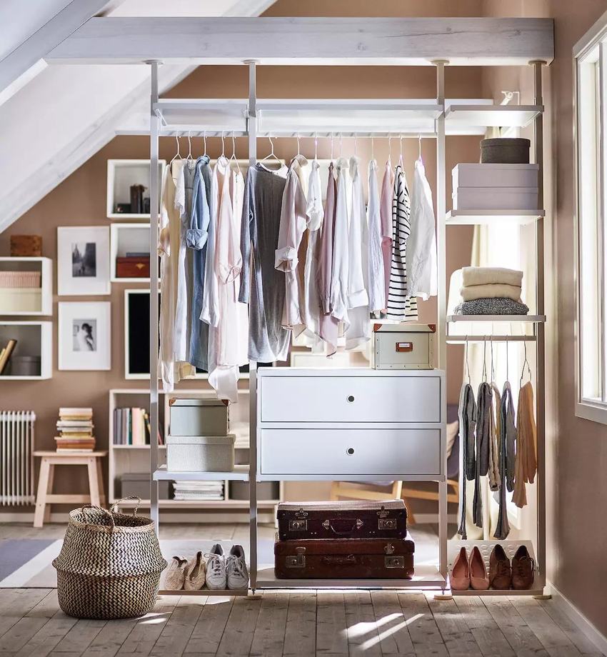 Отличный пример мини-гардеробной, которая занимает мало места. Каркас и полки для нее нужно подбирать под цвет стен, чтобы они не выделялись на их фоне.