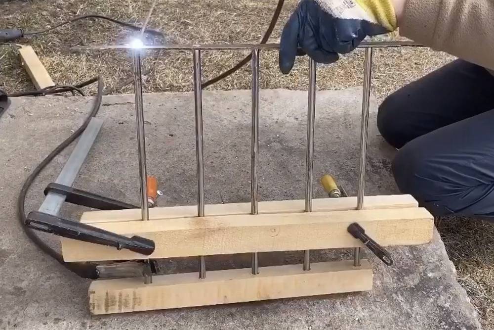 Затем взял сварку. Чтобы точно приварить прутки к основе, я временно использовал деревянный брусок: в нем тоже насверлил отверстий и закрепил с его помощью всю конструкцию.