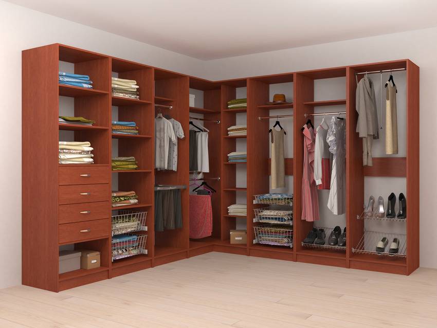 Для сборки углового варианта, фиксируются крепежи, и плоские детали крепятся друг к другу. Рынок предлагает огромный выбор данных гардеробных, но внешний вид не является солидным.