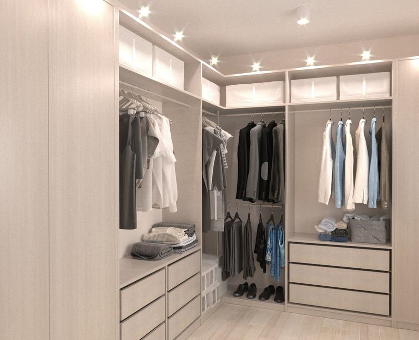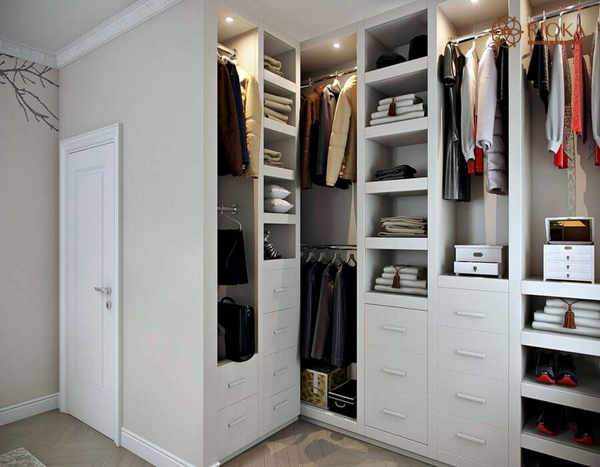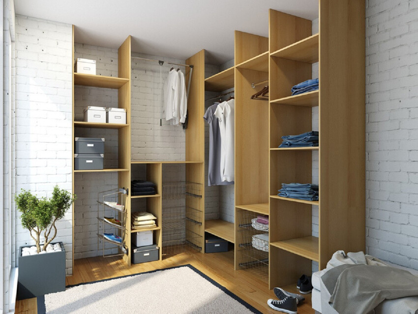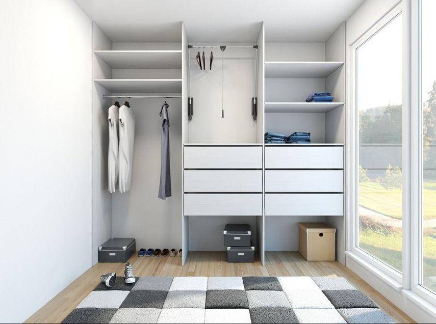 Г-образный. Можно применить как для обустройства гардеробной в углу, так и для узкого помещения, оставив одну из стен свободной;