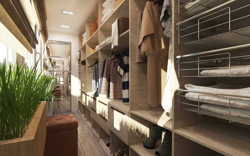 Этот вариант позволяет экономить свободное пространство в жилом помещении. За счет хорошей вентиляции воздух в гардеробной не будет застаиваться, а использование лоджии даст возможность хранить не только вещи, но еще и обувь, верхнюю одежду и другие предметы гардероба.