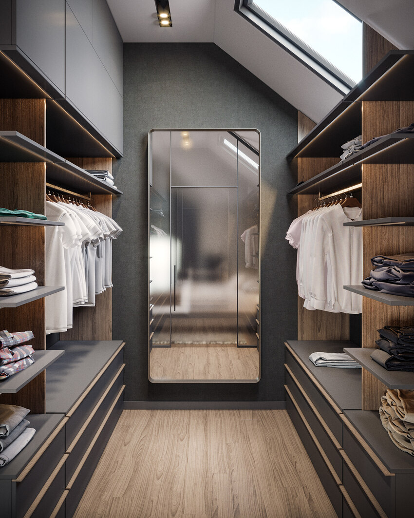 В гардеробной, неважно какого она типа, открытого или закрытого непременно должно быть зеркало больших размеров. Это упростит подбор нарядов, избавит от необходимости переносить каждую вещь из одной комнаты в другую для примерки