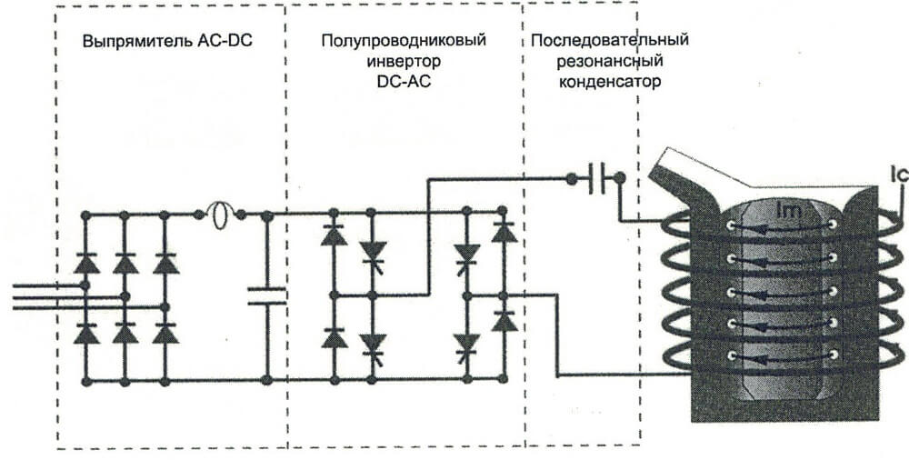 Теплотехническая схема работы такого агрегата не является сложной: источник тока инвертор, сосуд для нагрева воды с патрубками на вход и выход циркуляционного теплоносителя и трубной системы с приборами отопления.