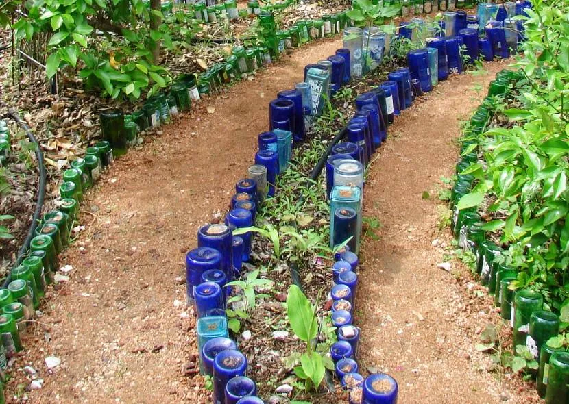 - Бутылки, причем подойдут и пластиковые, и стеклянные из-под пива и лимонада. Для эффектности используйте тару одинаковых размеров и цветов. Вкопайте бутылки горлышком вниз, и залейте это цементом, чтобы получить необычную оградку.