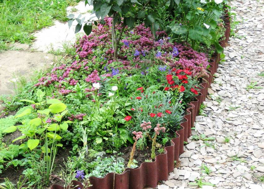 Совет!Чтобы обозначить границы тех или иных культур, удобно пользоваться лентой коричневых оттенков. А при формировании оригинальных цветочных композиций уместно применять ограждения более ярких цветов.