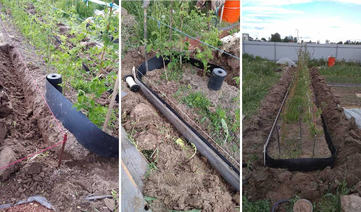 Если работать в одиночку, хорошо натянуть не получится, будут некоторые изгибы. Это не просто эстетический дефект — грунт, вода, мульча могут высыпаться/выливаться. Если помощников нет, есть другой способ. Нужно ленту сшить в кольцо (просверлить дрелью отверстия, стянуть проволокой), найти металлические или деревянные колышки. Разложить ленту вокруг предполагаемой грядки, забить два колышка в торце грядки с одной стороны, взять два других колышка, натянуть ленту, забить их. Тут фокус в том, что можно попеременно вытаскивать колышки, лучше натягивая ленту. Когда она будет ровной, можно выкопать траншею, сдвинуть вниз по колышкам пластик, закопать. Гарантированно получится ровный бордюр. Колышки можно затем вытащить, чтобы не пораниться ненароком.