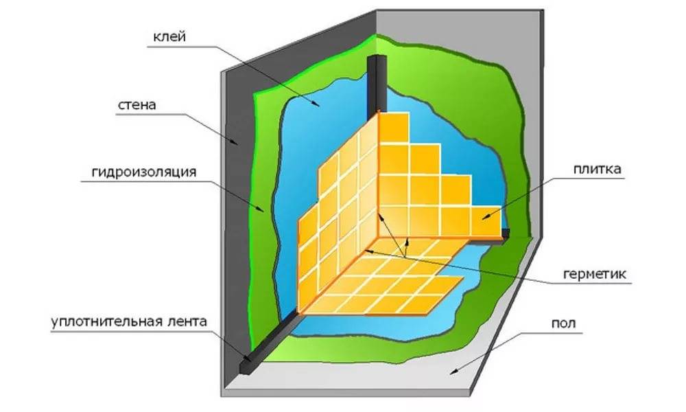 Схема обустройства обмазочной гидроизоляции для душевой кабины