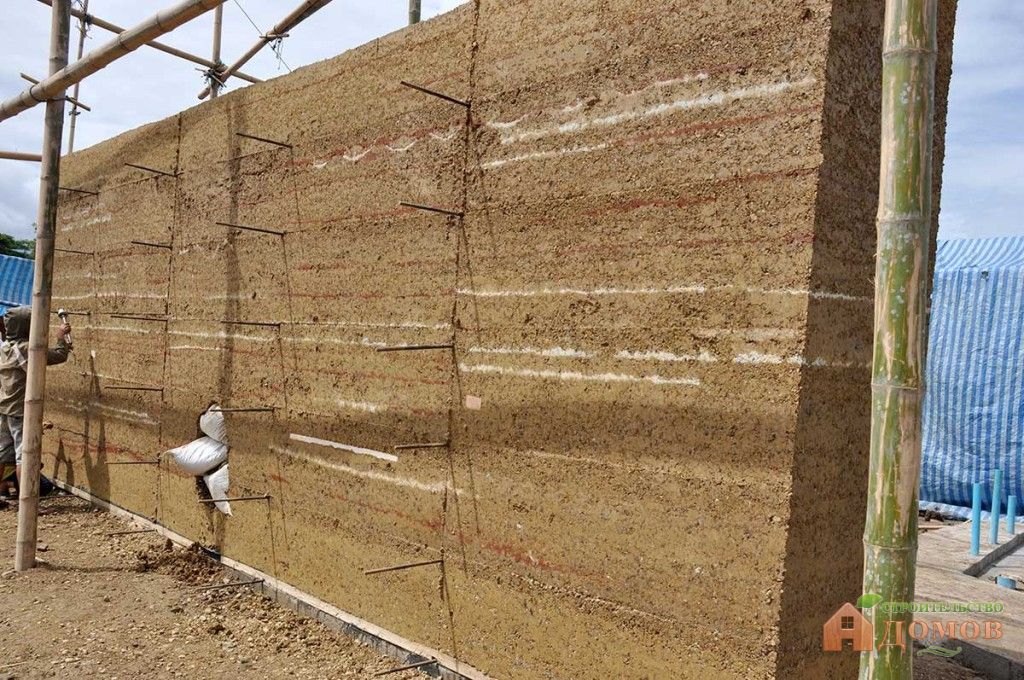 Для армирования стен глинобитных домов своими руками поверх каждого ряда мешков в два ряда укладывают и закрепляют скобами колючую проволоку. Швы между мешками заполняют смесью цемента, песка и извести либо глиной с добавлением рубленой соломы. Дополнительную прочность конструкции можно придать и с помощью заточенной стальной арматуры, которую вбивают вертикально сквозь мешки.