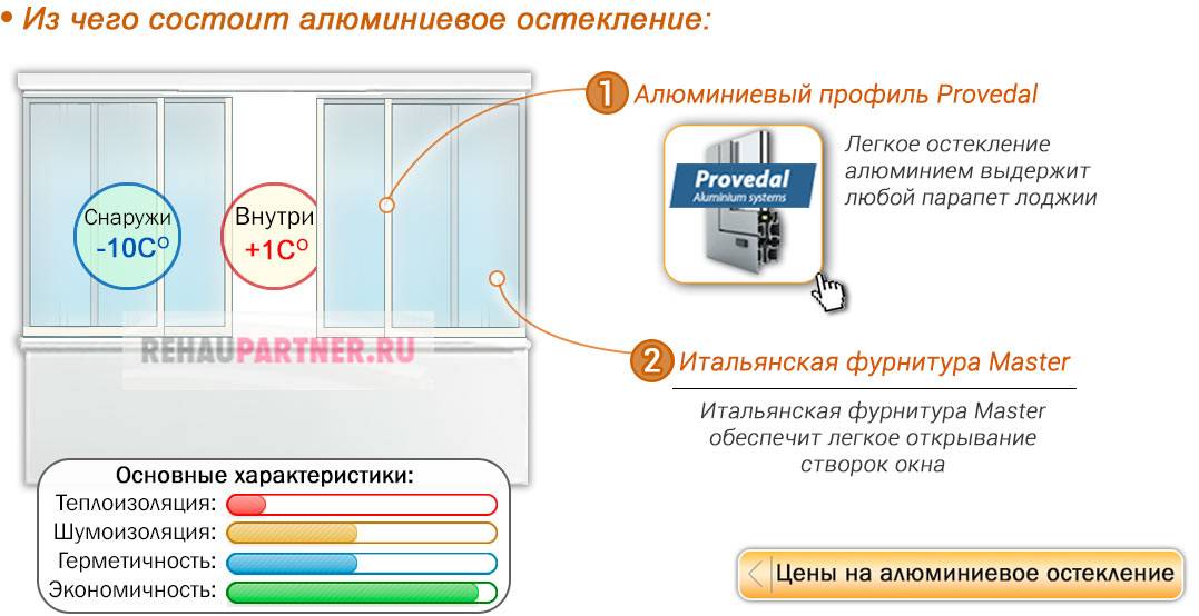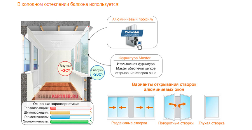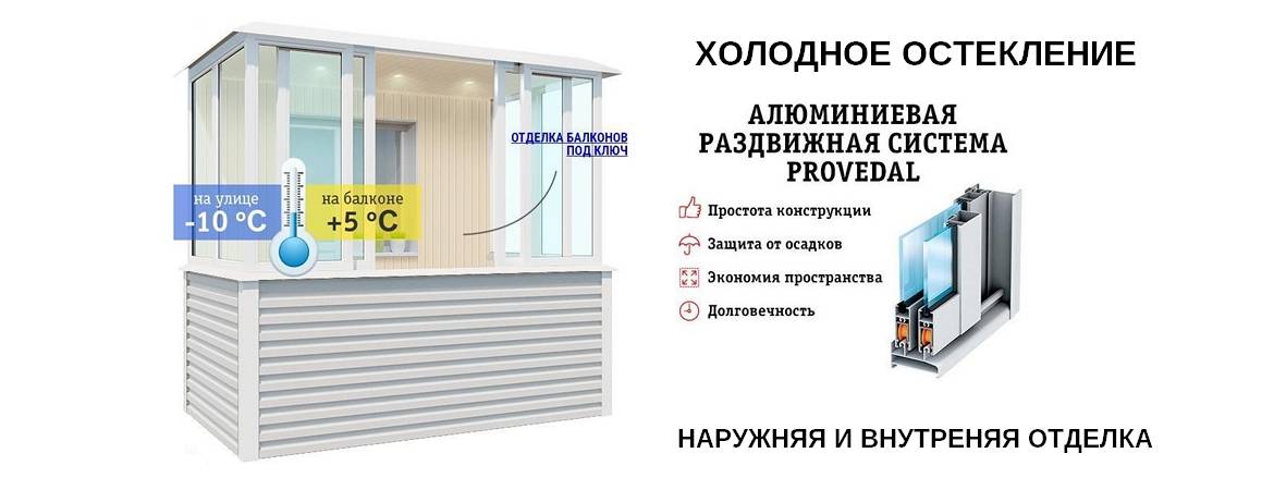 - Холодное. Используется раздвижной алюминий (например, Provedal). Применяется для изоляции балкона от внешних воздействий и создания дополнительного пространства под хранение вещей.