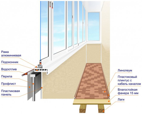 При остеклении балкона нельзя забывать о козырьках и отливах, на рисунке — схема их устройства