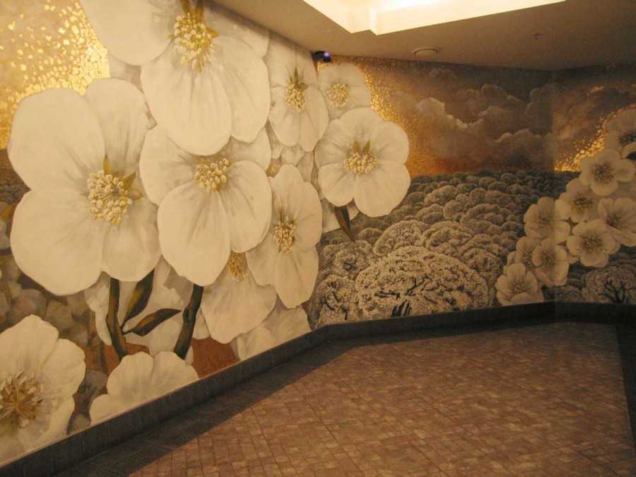 Аэрография скрывает недостатки, отвлекая от них внимание. Если перепады высоты на стенах слишком значительны, а площадь комнаты небольшая, выравнивание отнимет ещё объем. Цветочные мотивы