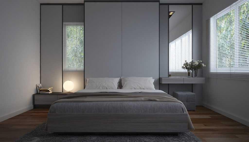 Нейтральная цветовая гамма позволит быстро успокоить нервы и подарить отдых глазам. Чаще всего для современных спален применяют серую отделку во всем великолепии ее оттенков: от цвета серебристой стали до мокрого асфальта.