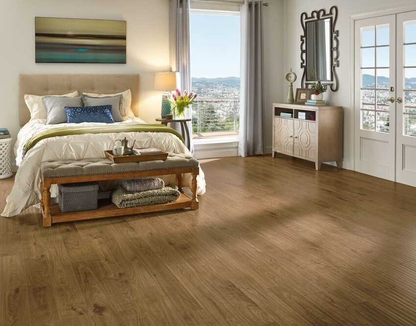 В качестве более экономного варианта в современных спальнях используется ламинат – оптимальный материал по соотношению цена-качество, долговечности, простоте монтажа и эксплуатации.