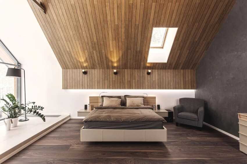 Ещё одно новое веяние — покрытие потолка ламинатом. Такой вариант отлично подходит для эко-стиля, шале, минимализма.