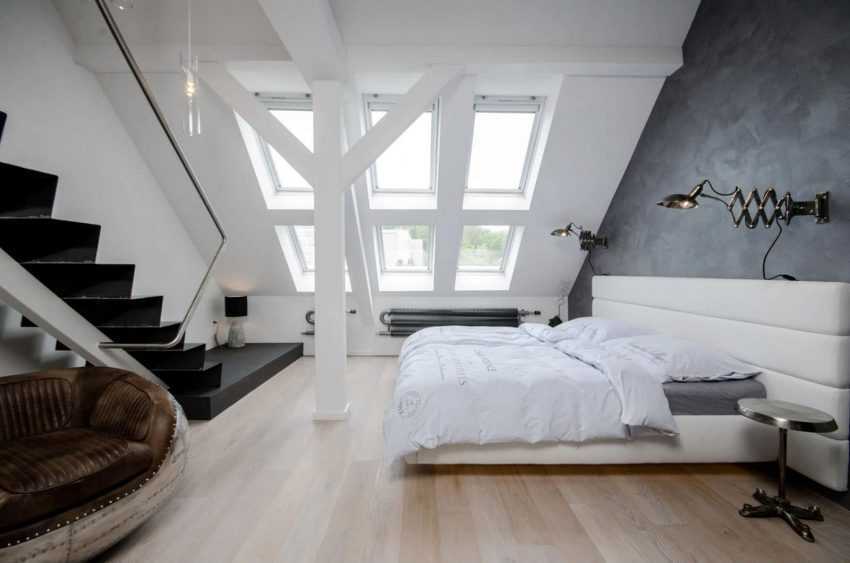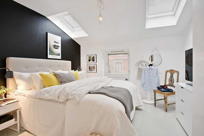 Просторная и яркая спальня на мансардеИсточник pinterest.ru