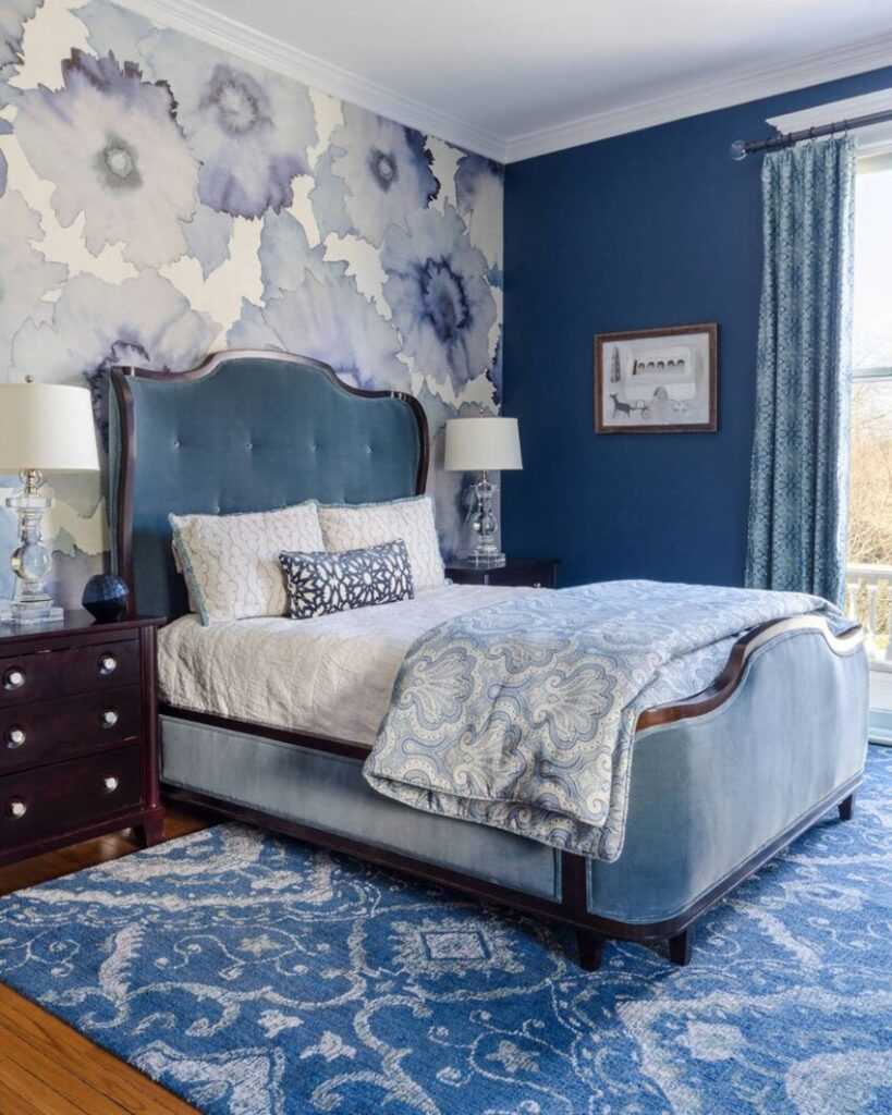 Для придания невысокому помещению большего объема выполняют акцентную стену за кроватью в насыщенном модном сине-красном тоне, который захватывает и часть потолка.