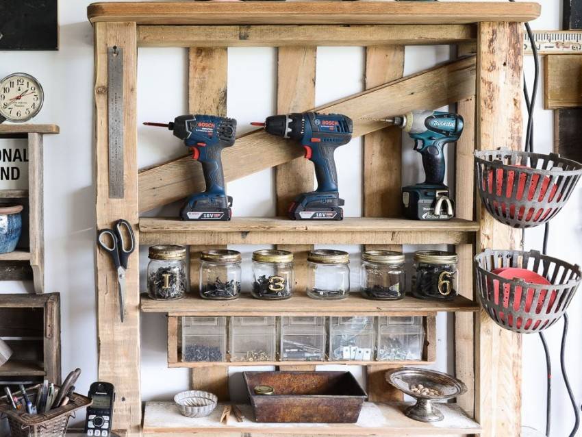Стеллаж из поддона для хранения инструментов в домашней мастерской.