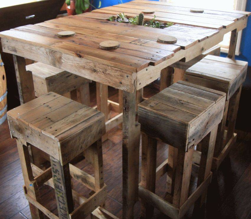 Обеденный стул и высокие табуреты, выполненные из деревянных поддонов.