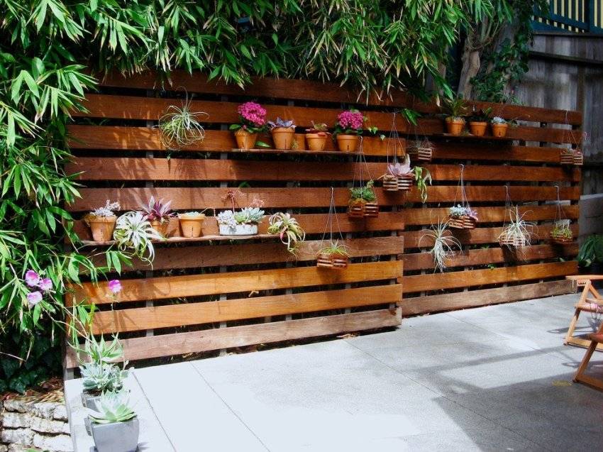 Забор на дачном участке построен из поддонов и дополнен полками для горшков с цветами.