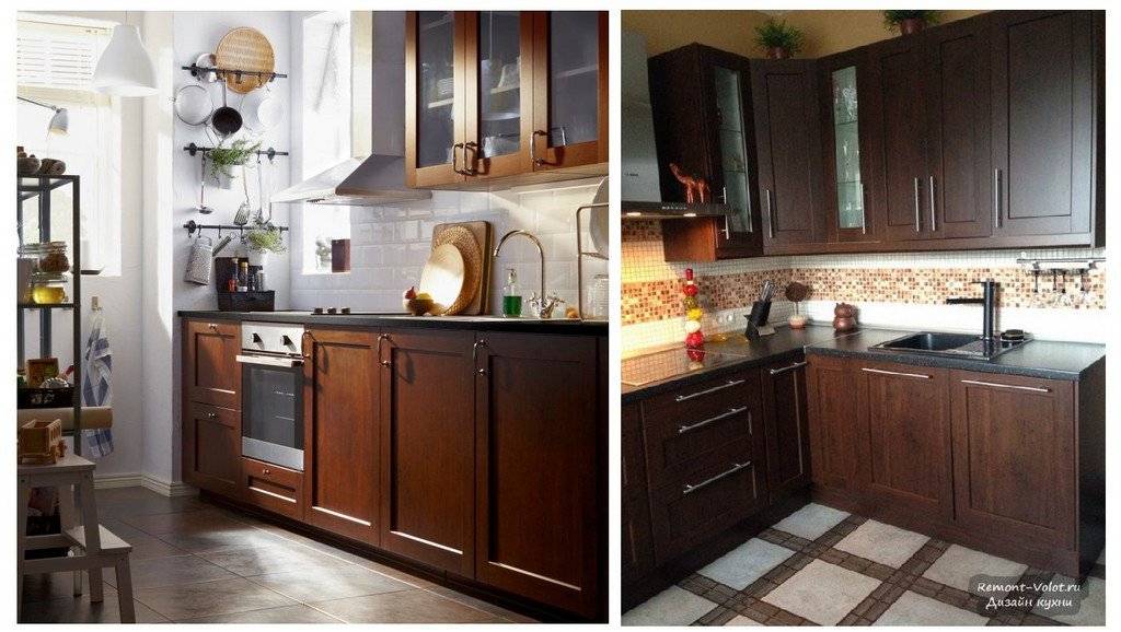 Черно-коричневый цвет фасадов уместен в просторных помещениях с большим количеством света. Разбавить избыток темноты помогут белоснежные либо яркие стены, узорчатый или цветной кухонный фартук, стулья для кухни, столешница и другие горизонтальные плоскости пастельных тонов и, конечно же, светлые оттенки дерева.