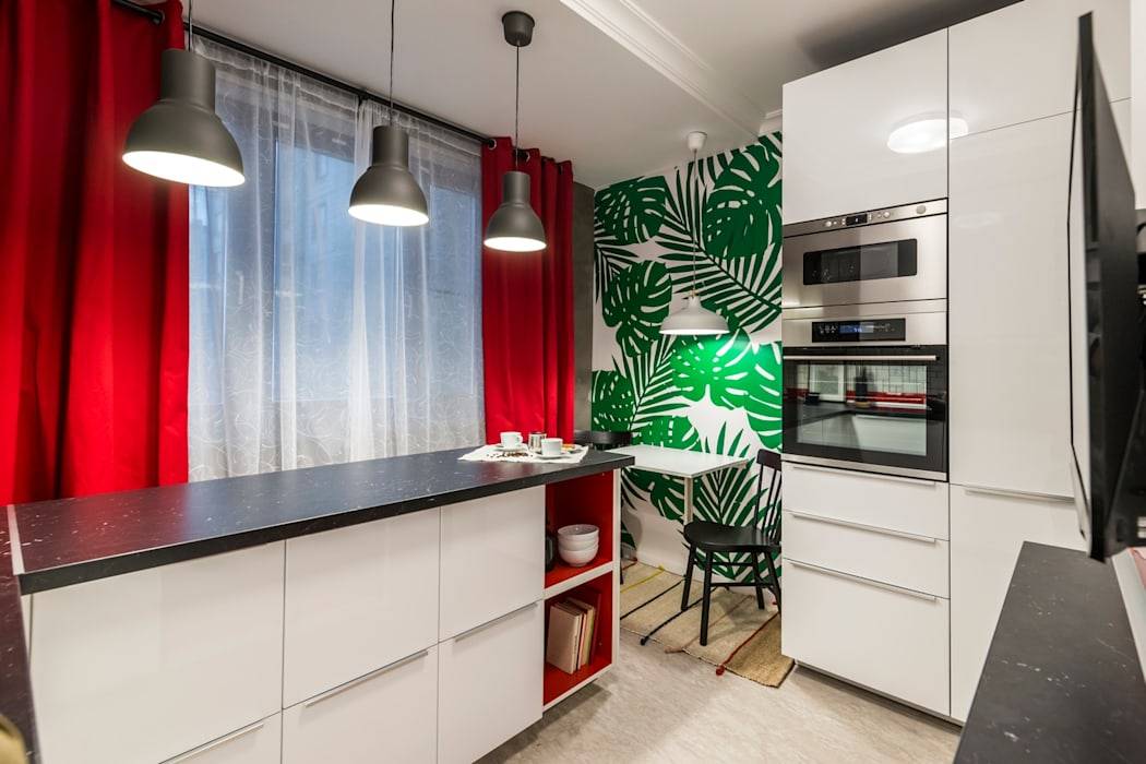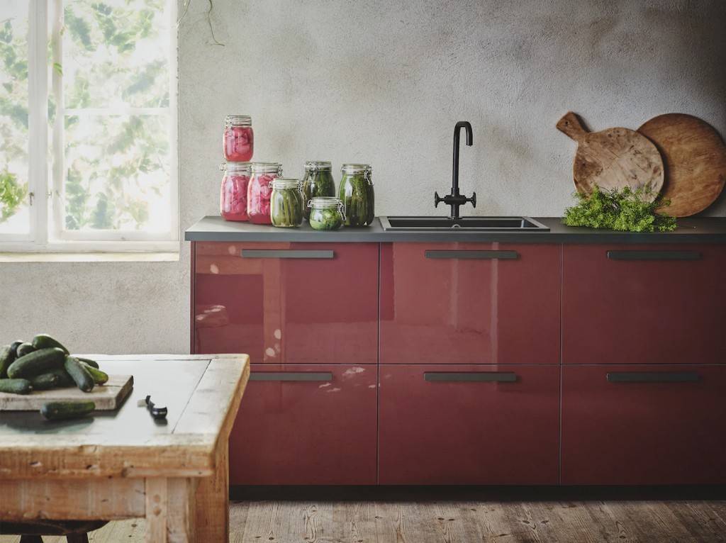 «Взбодрить» интерьер можно с помощью ярких оттенков икеевской мебели, которые используются в сочетании с нейтральным цветом. К примеру, желтые столешницы на белом фоне или красный фасад первого уровня в сочетании с более сдержанным вторым.