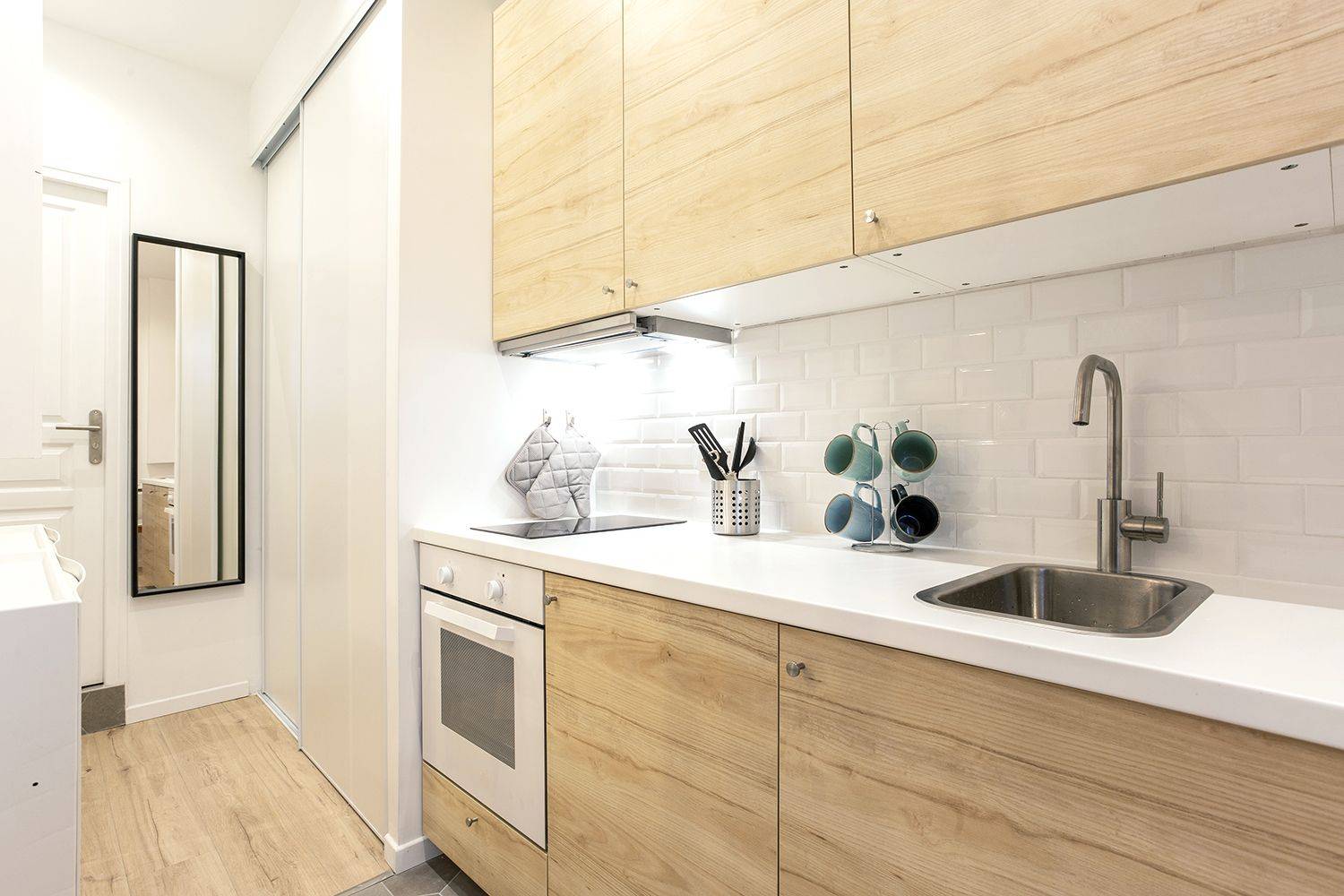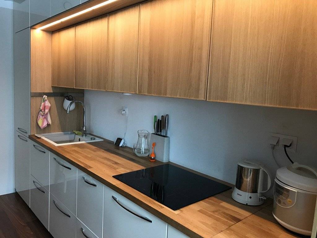 Подумайте о варианте с деревянной столешницей, которая разбавит надоевшую цветовую гамму. Посмотрите, каким компактным и вместе с тем довольно приятным может быть интерьер маленькой кухни от «ИКЕА». Белые фасады украсят бежевые ручки мебели, как и в точности до наоборот. Взгляните на фото – как этот, на первый взгляд, незначительный элемент меняет общее впечатление.