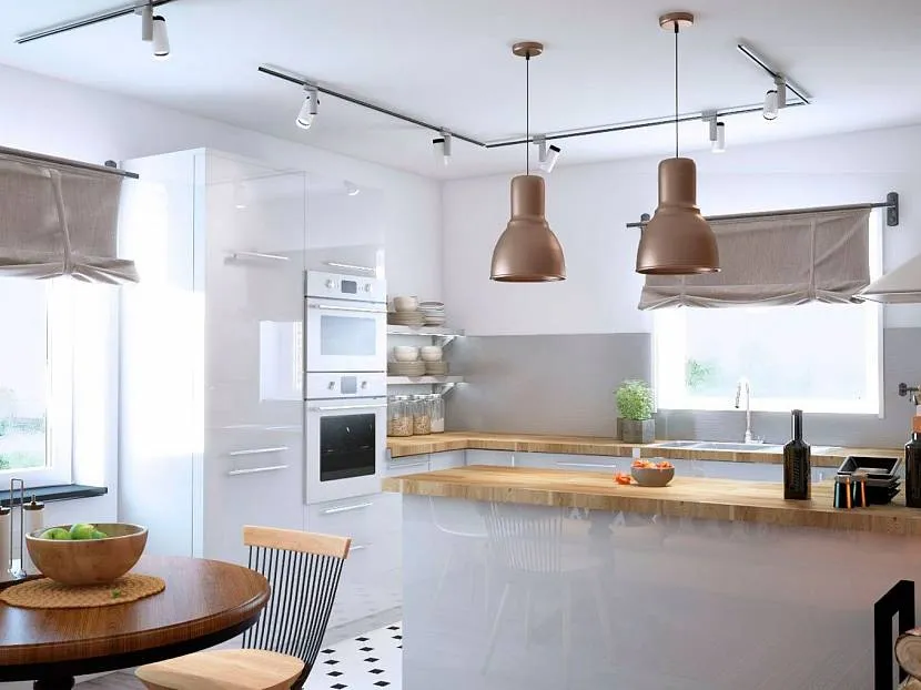 Идеальный вариант освещения – встроенный свет в потолке. Это очень легко реализовать, если вы выбрали один из перечисленных выше вариантов современных потолков. Декоративная подсветка должна присутствовать на шкафчиках и полках. Это красиво и практично, так как облегчает работу на кухне. Очень удобно и экономично делать такую подсветку с помощью светодиодных лент. Над обеденным столом можно разместить либо одну большую люстру, либо несколько свисающих одинаковых светильников.