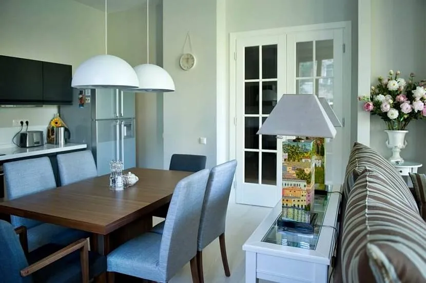 Освещение. Пространство (особенно объединенное) должно быть равномерно освещено. Добиться нужного уровня освещенности поможет комплексный подход, когда источники света располагаются на разных уровнях. При оформлении используются люстры, торшеры и настольные лампы, бра. Популярны точечные и трековые светильники, встроенная подсветка в мебели, стенах и полу.