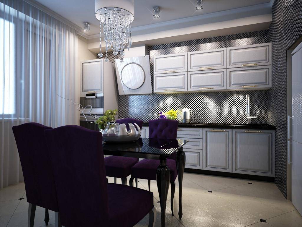 Отделка помещения кухни заключается в окрашивании стен и дверей в светлые тона. Пол должен быть контрастным по отношению к стенам. При отделке пола у вас есть два вариант – керамическая плитка и влагостойкий ламинат (специально предназначенный для кухонных помещений). Что касается потолка, то он должен быть светлым и гладким. Лучше отдать предпочтение какому-нибудь современному варианту, например, двухуровневому потолку из гипсокартона или натяжному потолку.