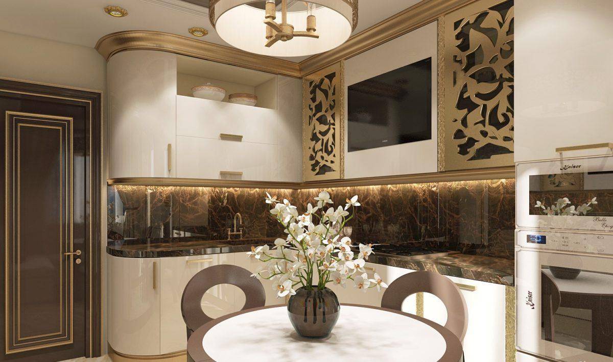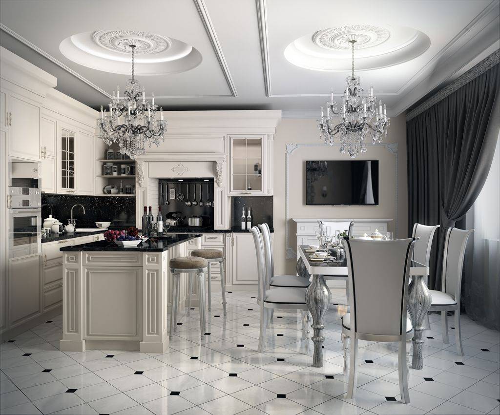 Освещение в классической кухне традиционно состоит из нескольких источников. В центре композиции – роскошная люстра, которая размещается либо четко по центру комнаты, либо над большим обеденным столом. Выбирай многоступенчатые и многоярусные конструкции с хрустальными подвесками или люстры в виде массивных подсвечников.