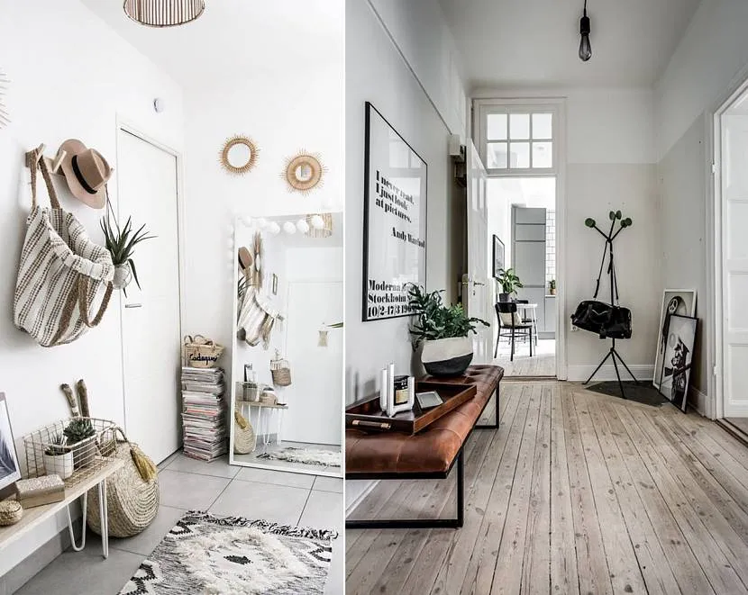 Такая прихожая — идеальный выбор для ценителей современных минималистичных решений. Главными признаками скандинавской прихожей являются стены, выкрашенные в белый или молочный цвет, деревянные полы (можно заменить стилизацией под дерево), минимум мебели и декора. На стенах прибиваются крючки для верхней одежды, сумок и зонтов. Из декора подойдет зеркало в простой раме и фотографии.