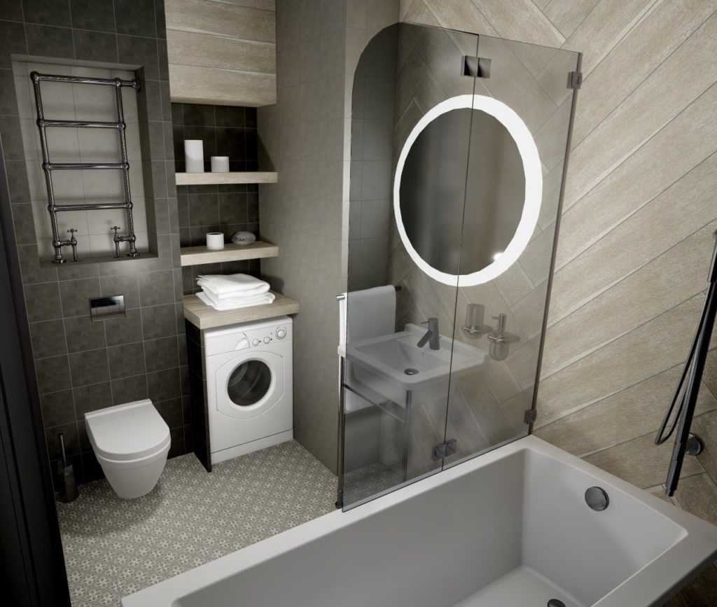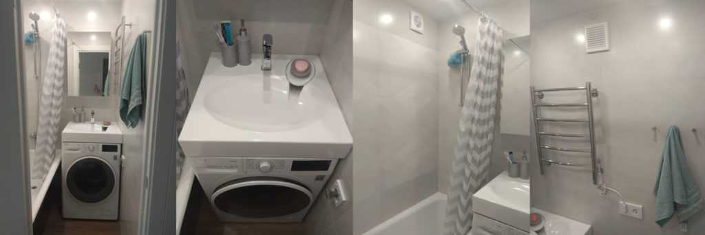 Если санузел совмещённый, для стиралки можно найти и отдельное место. Но такой дизайн часто выглядит излишне загромождено.