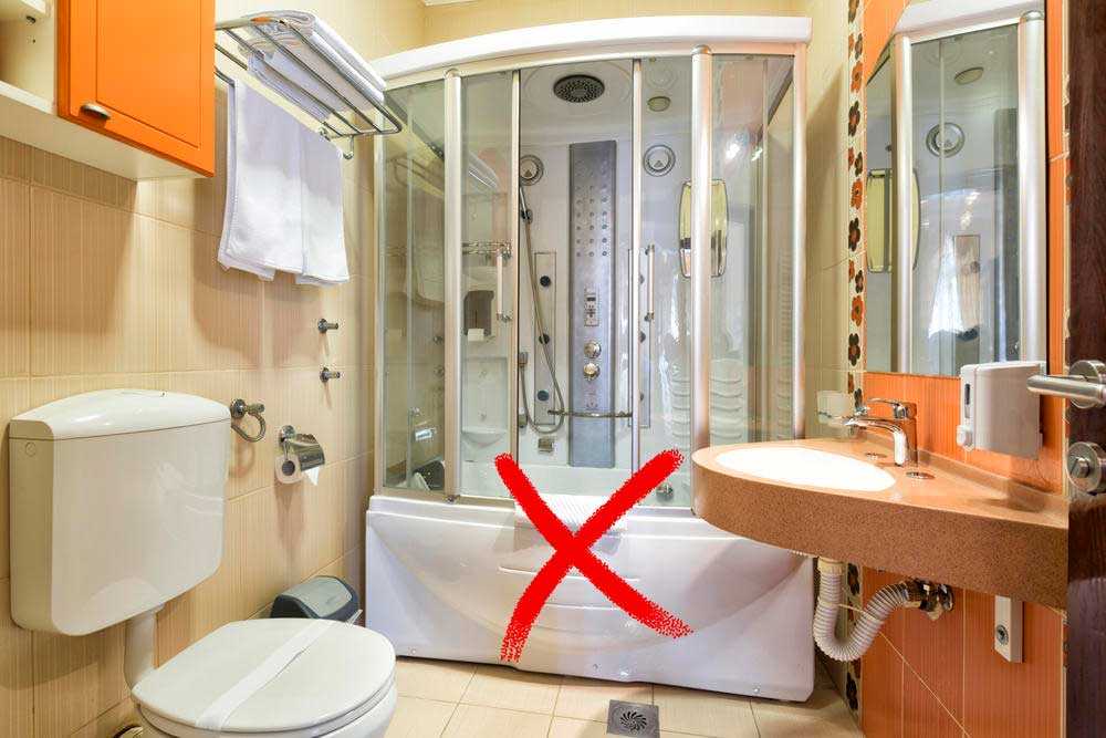 В маленькой комнате сантехнику и бытовую мебель необходимо расположить таким образом, чтобы она была удобной в использовании и экономила площадь. Для этого большая традиционная ванна меняется на компактные угловые модели. Можно также поставить душевую кабину, состоящую из поддона и ограждения. Она хорошо поместится в углу помещения и позволит справа или слева от себя установить раковину, рационально используя пространство. При этом многие хозяева «хрущевок» отказываются от монтажа душевой и ванны – они просто оборудуют слив в полу и крепят сверху душ, а для защиты стен от обрызгов в таком случае служит раздвигающая перегородка.