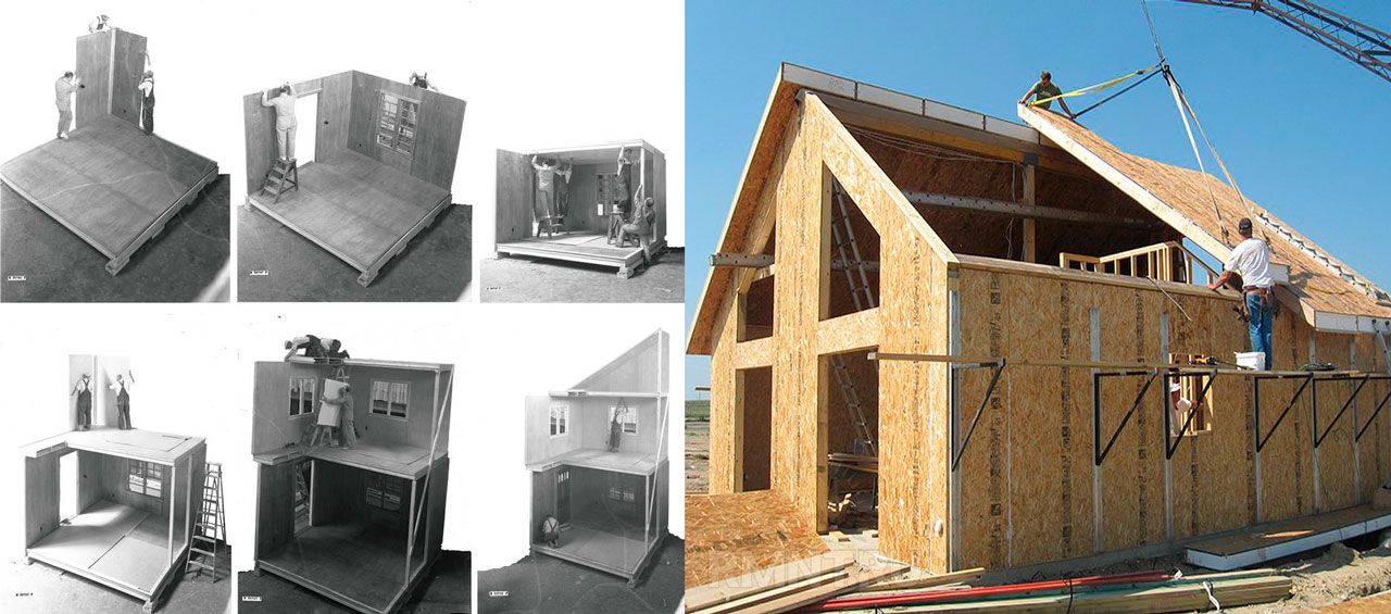 В Соединенных Штатах схемы создания дешевых домов фабричного производства развивались с 1930-х годов. Это было обусловлено высоким уровнем безработицы, небольшими доходами домохозяйств и нехваткой недорогого жилья во времена Великой депрессии. Конструкции сборных домов ориентированы на быстрое изготовление и легкую сборку. Фанера идеально подходила для стандартных, легких панельных систем, которые могли быть изготовлены на заводе и собраны на месте. Изобретение синтетических клеев в середине 1930-х годов также означало, что производители могли изготовлять новую водостойкую фанеру, идеально подходящую для наружного применения.Во время депрессии Лаборатория лесных товаров США (FPL) разработала экспериментальные «цельно деревянные» дома, которые изготавливались на заводе с использованием стандартных фанерных листов, а затем быстро установить на месте. В 1936 году они построили демонстрационный дом на Мэдисон Хоум Шоу. Двенадцать тысяч посетителей стояли в очереди, чтобы увидеть полностью меблированный дом. Они восхищались тем фактом, что детали были изготовлены на фабрике, и дом мог построить семь человек всего за 21 час. Тогда это была революционная технология строительства, опередившая свое время. Но массово строительство домов по СИП технологии началось только с 80-х годов прошлого века.