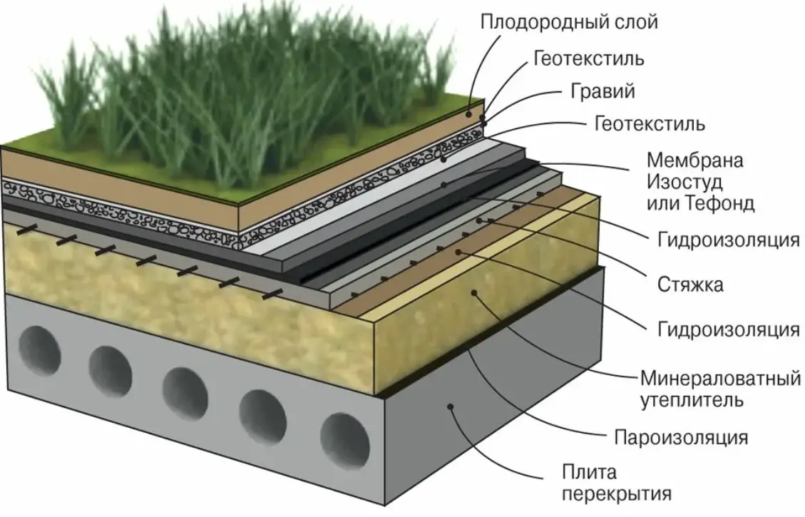 Внушительная толщина плодородного слоя диктует определенные требования к степени жесткости и надежности основания. Несущие конструкции должны выдерживать не только вес земли, но также вес посаженных в нее растений, мебели, установленной в импровизированном саду и людей, которые будут там отдыхать. К этому стоит прибавить и вес воды, которая может утяжелить грунт во время дождей.