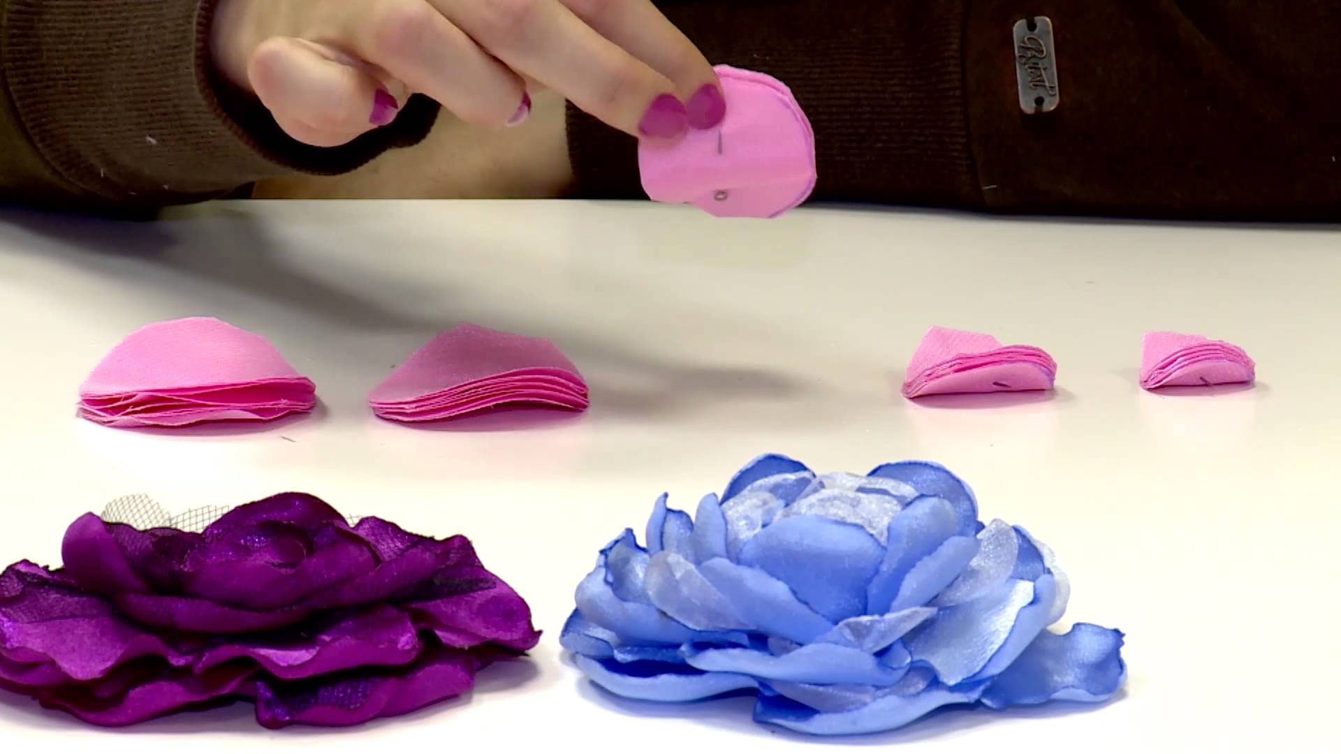 - Чтобы из органзы получилась роза, необходимо перед обжиганием, на каждом круге сделать 4-5 надрезов на равном друг от друга расстоянии. После обжигания получатся лепестки, загнутые вверх. Именно так их и следует укладывать один на другой.