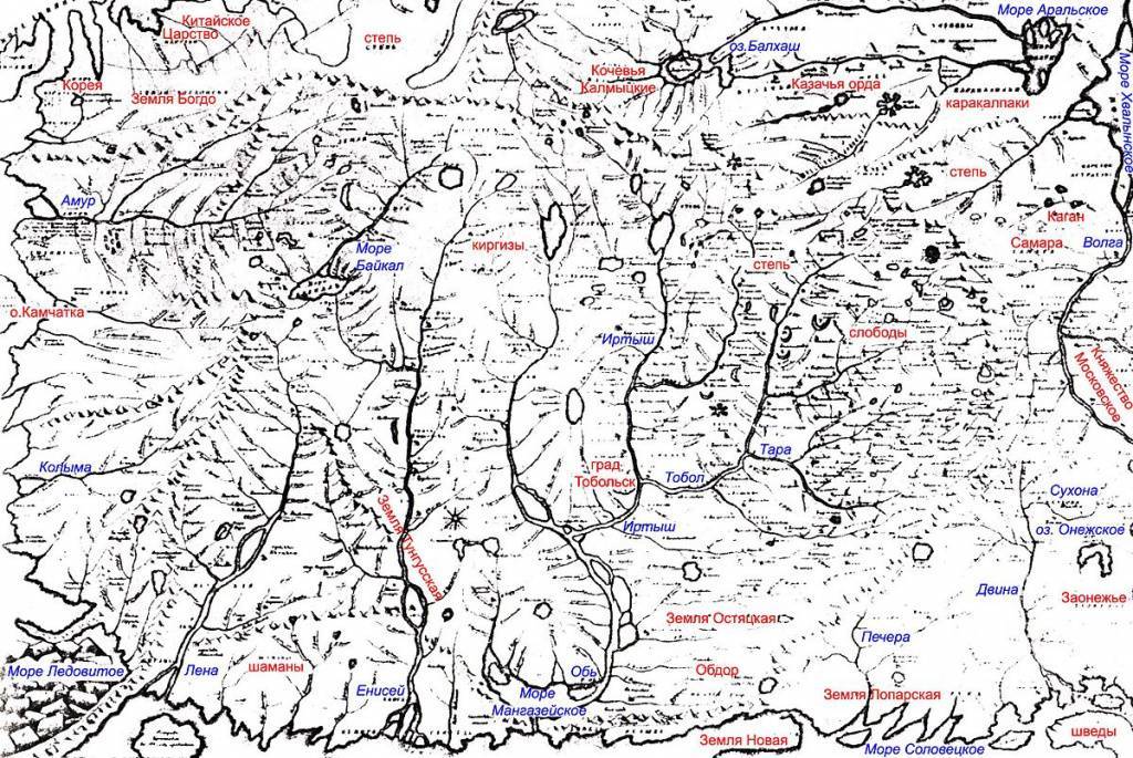 Чертёж всех сибирских градов и земель из атласа С. Ремезова. 1701 г.