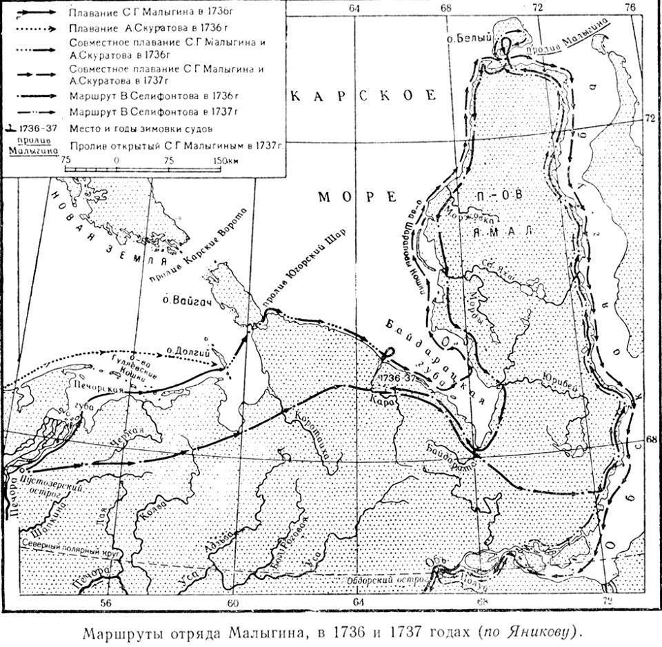 Маршруты отрядов Великой Северной Экспедиции, возглавляемых Скуратовым и Малыгиным.