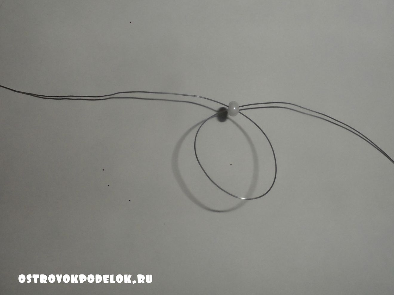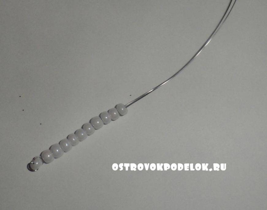 А пока краска сохнет, пора сделать туловище. На кончик проволоки надевается бусина, затем через нее пропускается второй конец проволоки и оба конца затягивается. Далее надеваем необходимое количество бусин, исходя из высоты туловища. В конце надевается бусина немного крупнее, перекручиваем проволоку, разводим концы, на каждый одеваем по бисеринке и перекручиваем проволоку, лишнее отрезаем.
