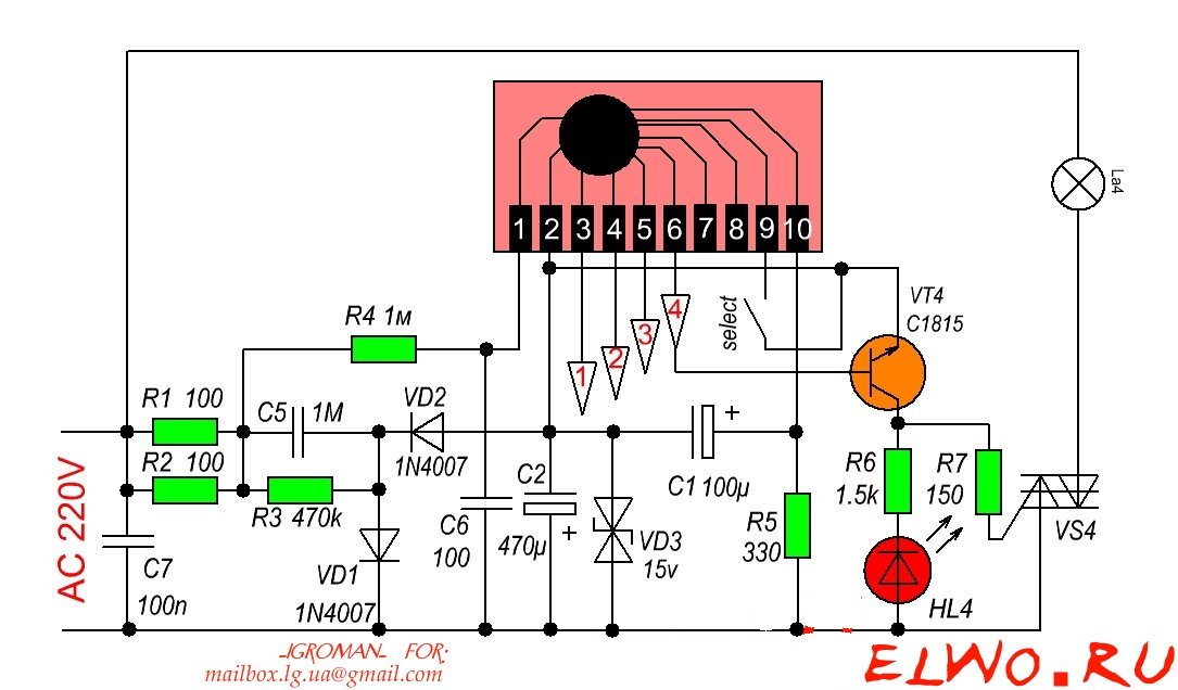 Большую часть начинки берём готовую – от небольшой коробочки, управляющей китайской гирляндой. Хотя количество режимов переключения выходов в таком контроллере будет невелико, простота изготовления схемы оправдывает дело.