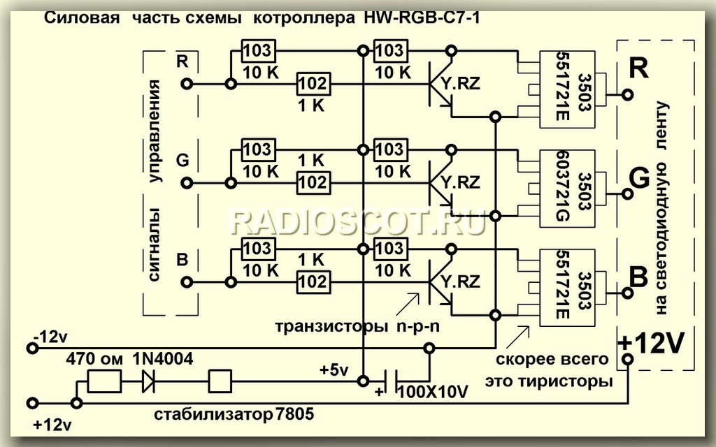 В промышленной схеме RGB контроллера используют на выходе мощные тиристоры по нижеприведённой схеме. На их входа и подадим сигналы с микросхемы управления китайской гирляндой.