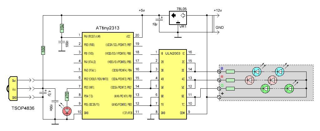 ) В развитии этой идеи им были разработаны и построены схемы управления нагрузкой переменного тока как с пульта так и по сенсорному управлению (но это тема отдельного топика и вероятно Сережа созреет для того, чтобы выложить свою работу на форуме). Меня же, чисто из прикладных соображений, заинтересовала возможность управлять RGB светодиодной лентой. За базу был взят вышеуказанный алгоритм.