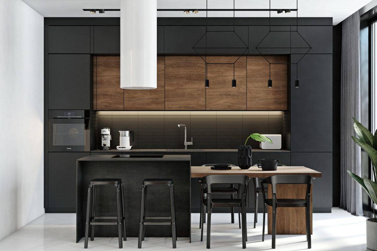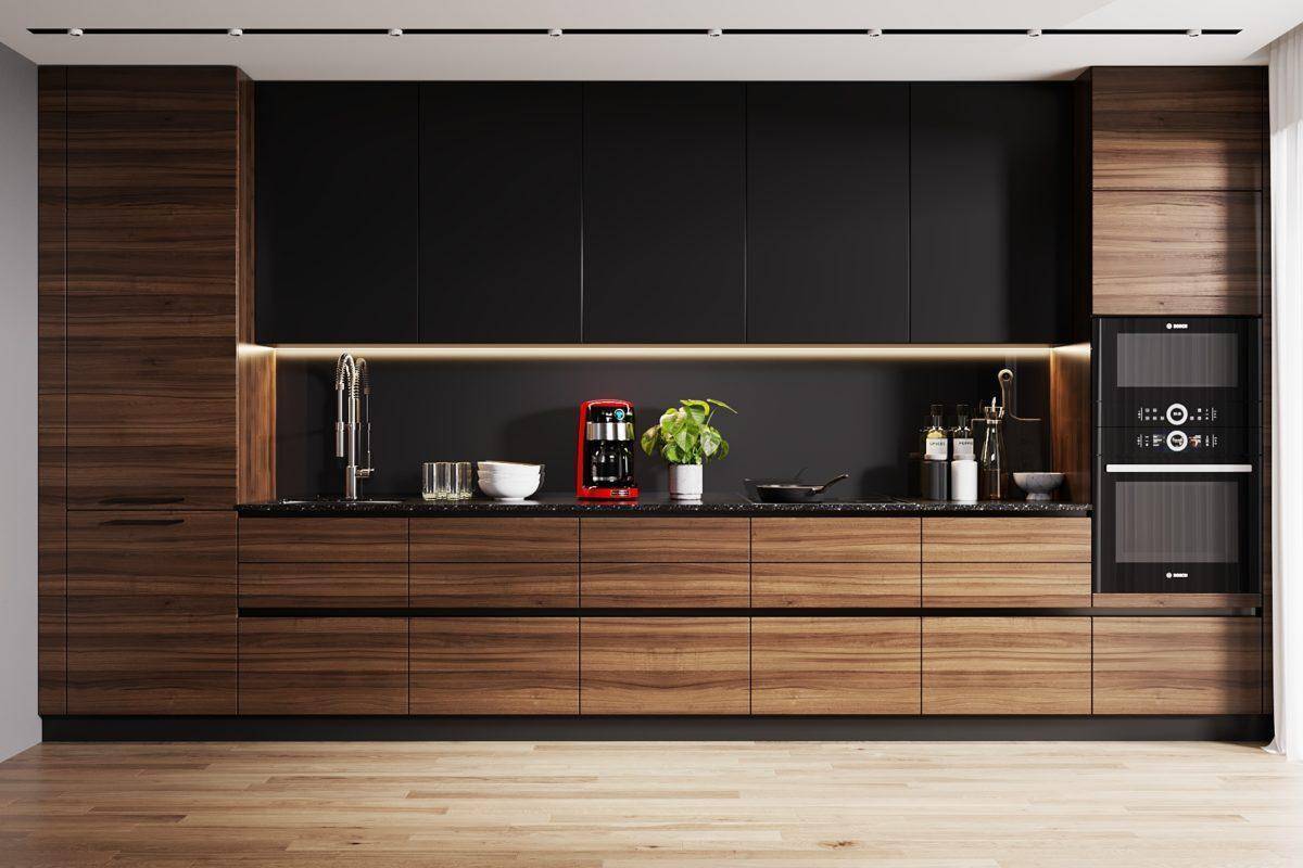 Сочетание чёрного с деревом — уютный и неизбитый вариант. Натуральный материал придаст кухне тепло и уют. Допускается дерево любых оттенков. Наиболее гармоничные: тёмный орех, оттенки бежевого и коричневого.