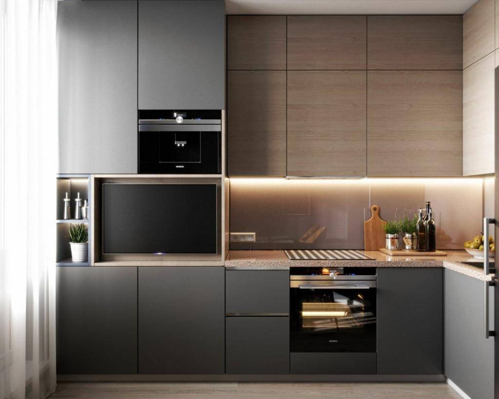 Любой оттенок серого это смесь чёрного и белого в разных пропорциях, поэтому легко сочетается с антрацитовыми тонами. Чёрно-серая кухня уместна в стиле минимализм или хай-тек. Однако без добавления акцентных пятен такой дизайн может казаться слишком пресным.