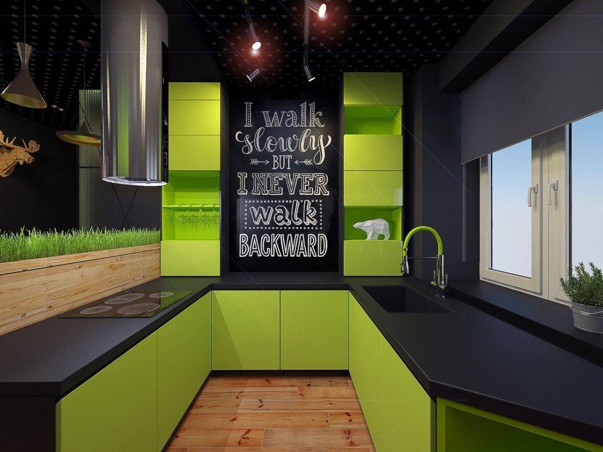В оформлении стен можно использовать меловые доски, которые будут выглядеть не полностью тёмными, за счёт белых надписей мелом. Для чёрно-красного гарнитура отличным решением является использование светлых вкраплений в отделке стен.