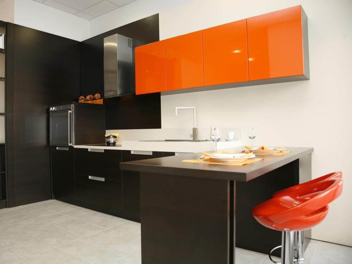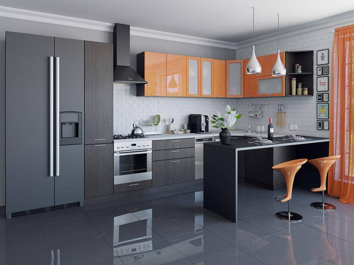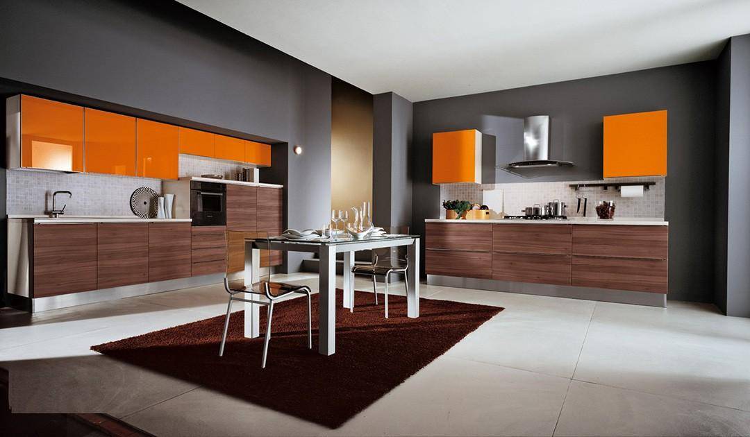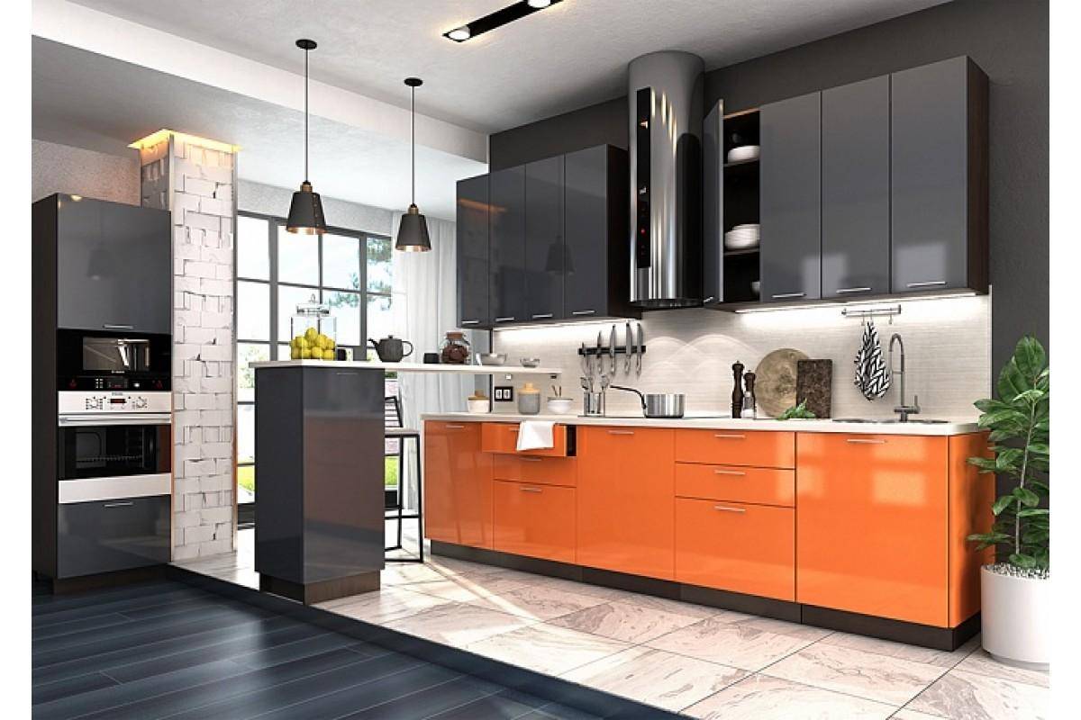 Цвет спелого апельсина в чёрной кухне выглядит вкусно и необычно. Оранжевый — тёплый цвет. Он мягко оттеняет тёмный.